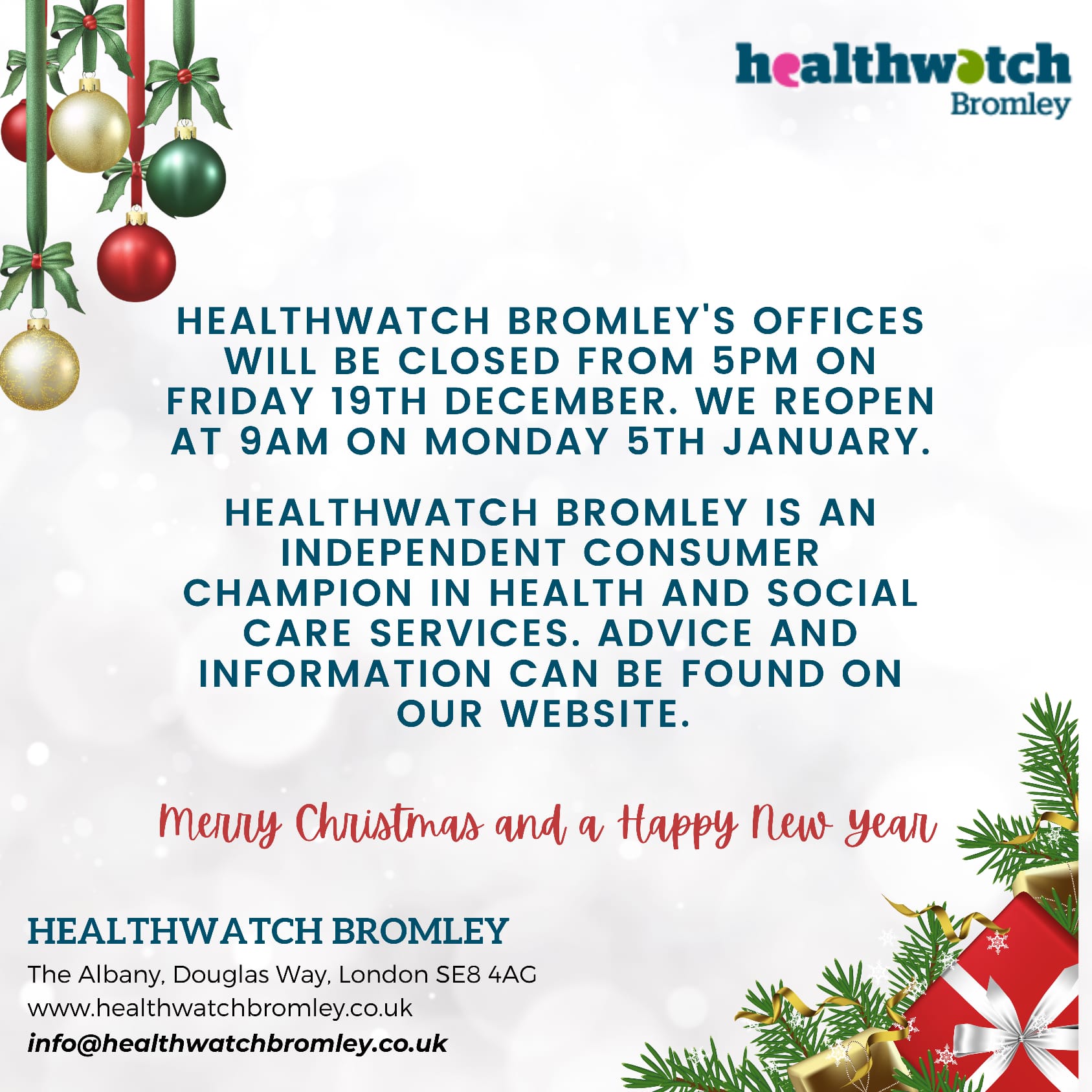 Healthwatch Bromley's offices will be closed from 5pm on Friday 19th December. We reopen at 9am on Monday 6th January 2025