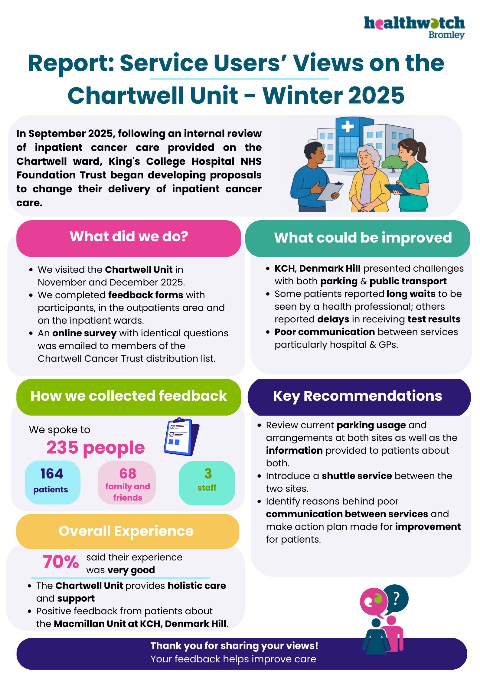 In September 2025, following an internal review of inpatient cancer care provided on the Chartwell ward, King's College Hospital NHS Foundation Trust began developing proposals to change their delivery of inpatient cancer care. Healthwatch Bromley undertook a major engagement exercise with patients, families and professionals. This report is written from the independent standpoint underpinning all our work.